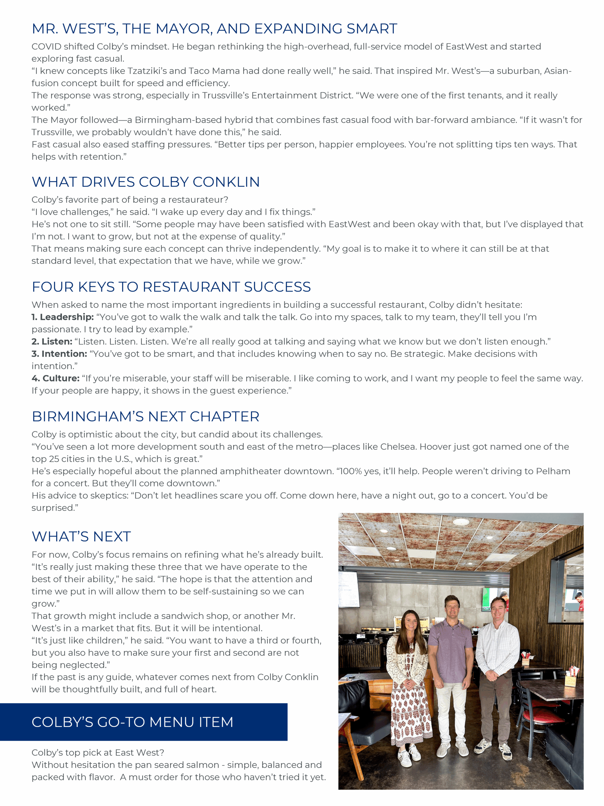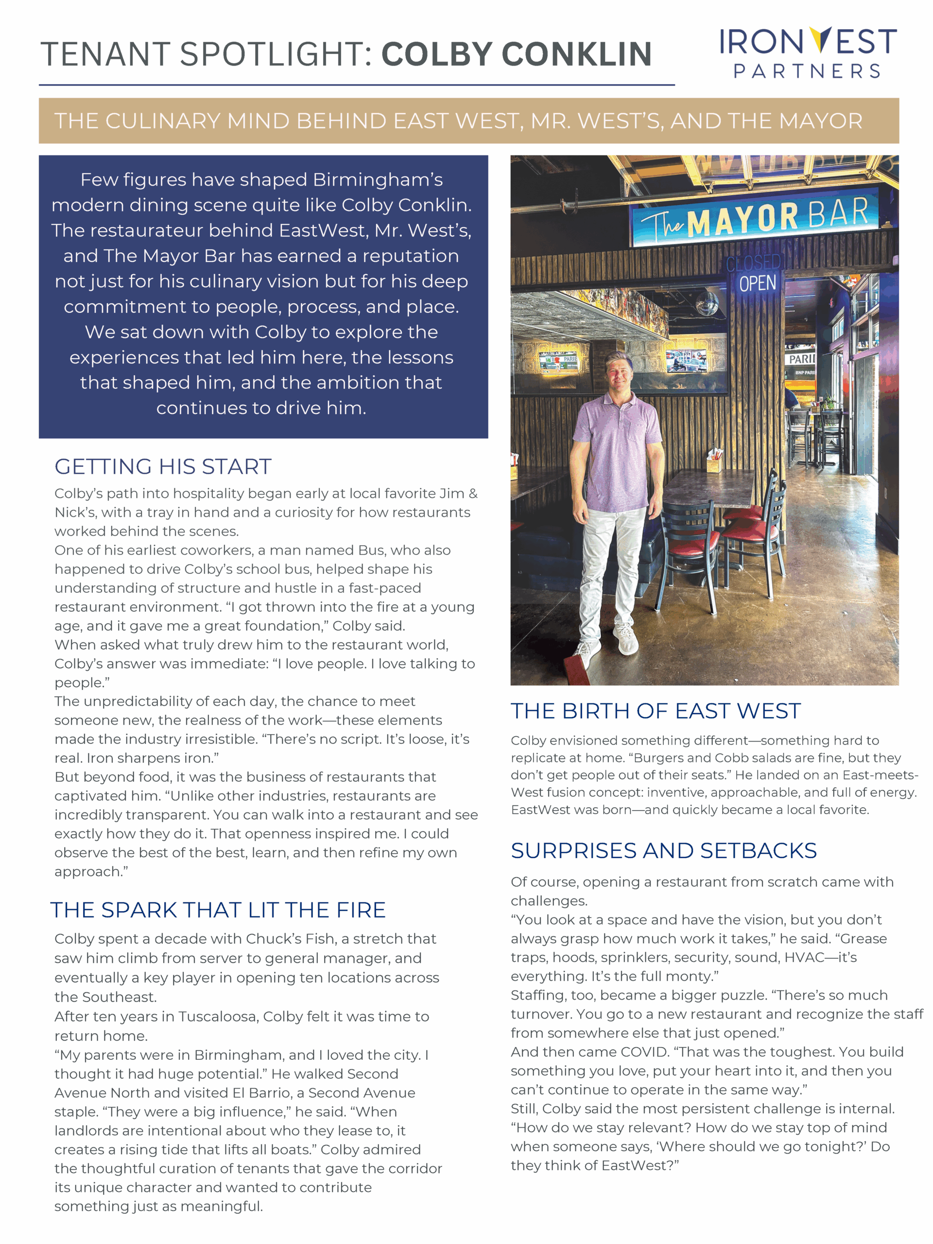 Few figures have shaped Birmingham’s modern dining scene quite like Colby Conklin, the restaurateur behind EastWest, Mr. West’s, and The Mayor Bar. We sat down with Colby to explore the experiences that led him here, the lessons that shaped him, and the ambition that continues to drive him.